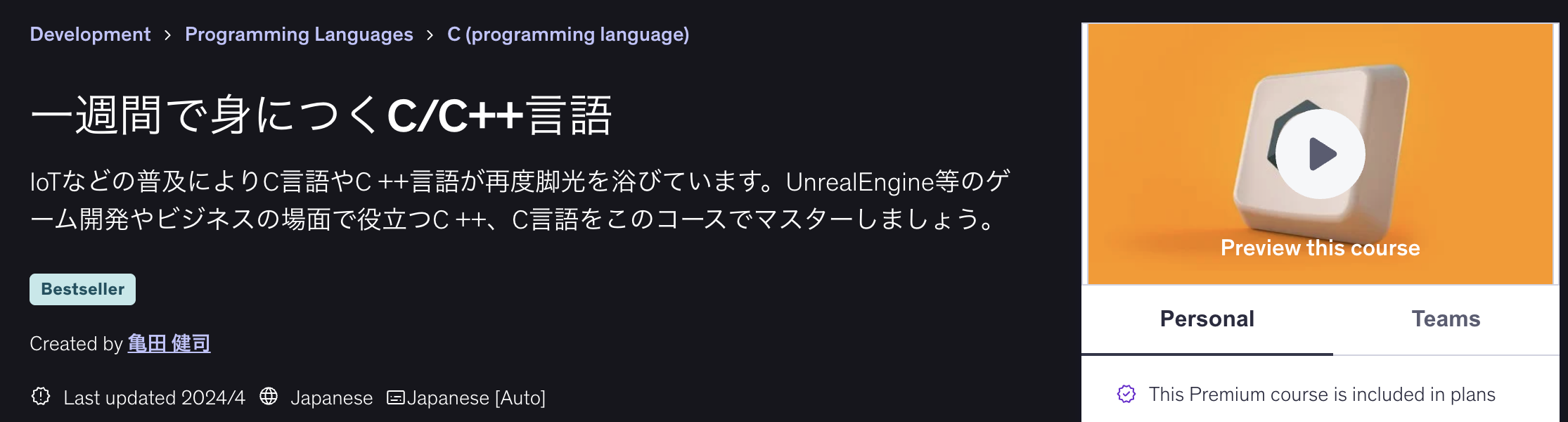 まずはC/C++を一気に俯瞰 | 一週間で身につくC/C++言語 | C/C++の基礎を通しで学び、ゲーム/組み込み/OS基礎にも触れる | 初心者〜初級 | 13時間 | C/C++をまとめて体験したい/ポインタでつまずいた経験がある | |